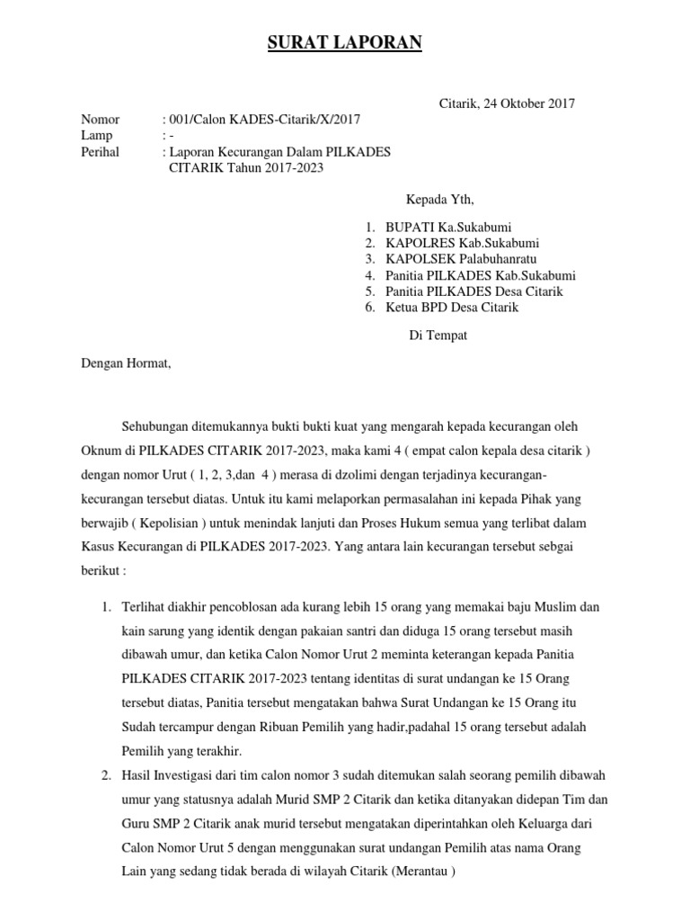 Kop Surat Laporan Kepolisian - Contoh Kop Surat from assets-a1.kompasiana.com Jun 21, 2021 · antara foto/raisan al farisi petugas kepolisian memeriksa kelengkapan pengemudi saat penyekatan arus balik menuju jakarta di gerbang masuk tol cileunyi, kabupaten bandung, jawa barat, rabu (27/5/2020). Pemilik rumah makan dan pengunjung pemesan sate yang berkelahi di telaga sarangan saling lapor polisi Agus mengatakan, korban tak mau memberikan kesaksian atas peristiwa pelecehan seksual. "kita masih melakukan pendalaman soal laporan keduanya," imbuh dia. Jun 09, 2021 · meski demikian polisi tetap akan memproses semua laporan tersebut. Sejauh ini, kata dia, belum ada upaya damai atau mencabut laporan dari kedua belah pihak. Dalam 1x24 jam, dia (sigit) enggak bisa ditahan, ujar kepala unit reserse kriminal polsek tebet iptu agus herwahyu adi saat dihubungi, kamis (17/6/2021) sore. Karena itu, pekerja yang berserikat juga menuntut haknya atas bonus sebesar rp.